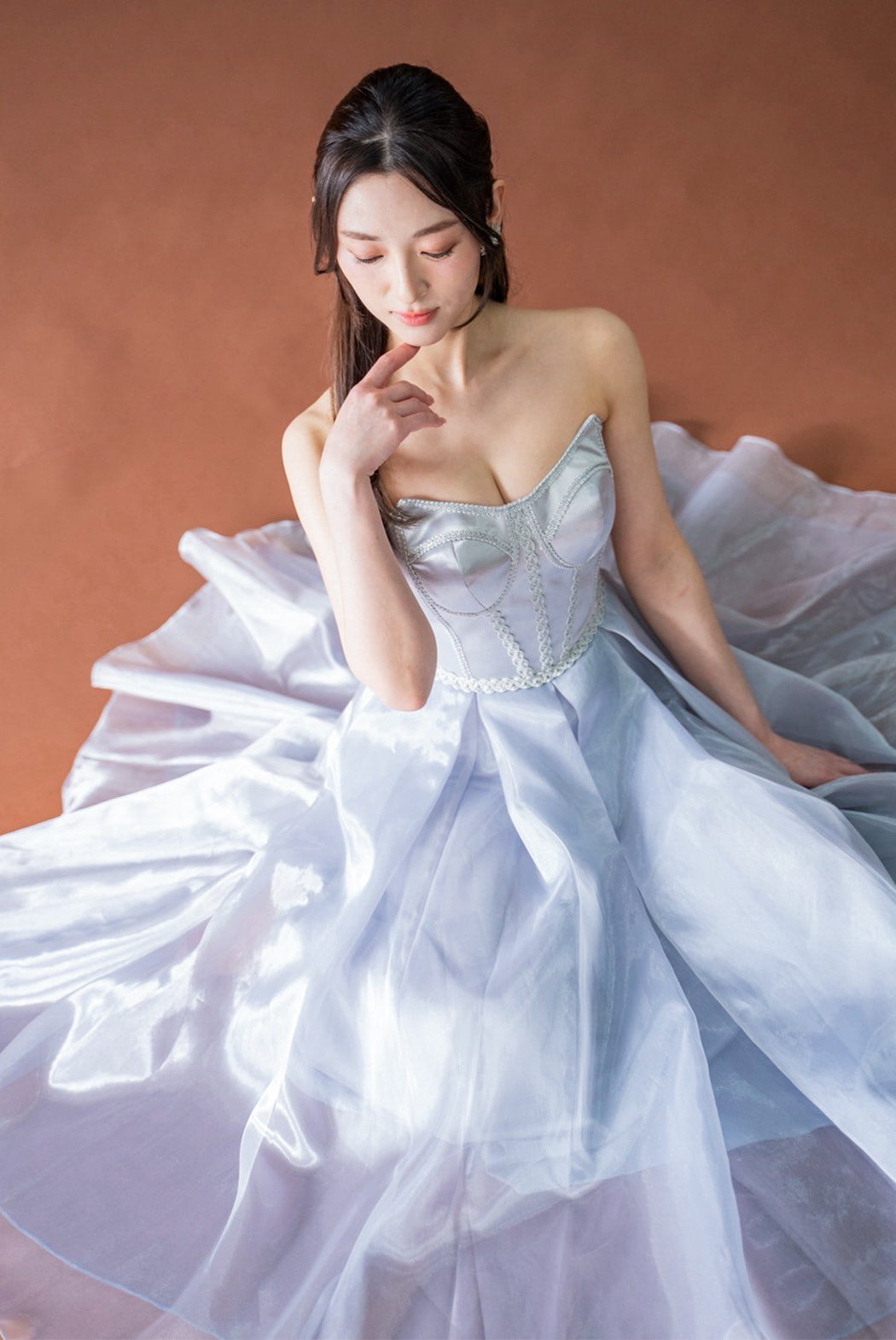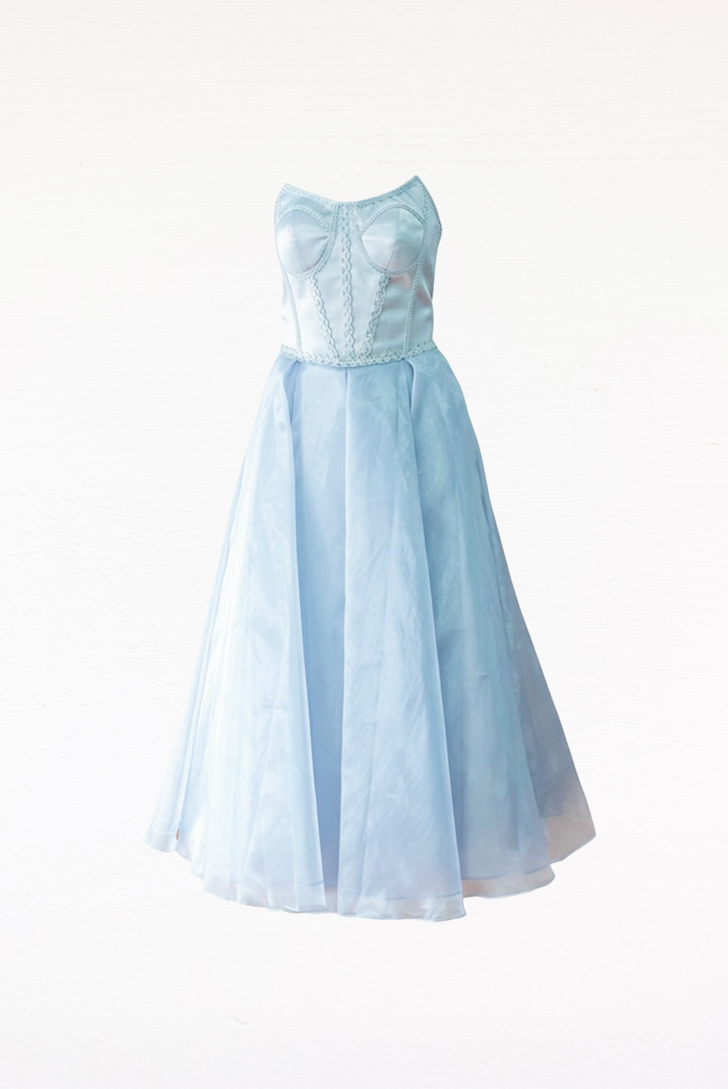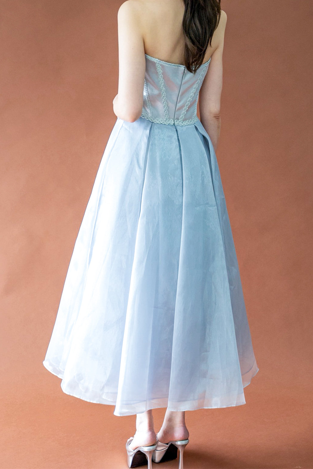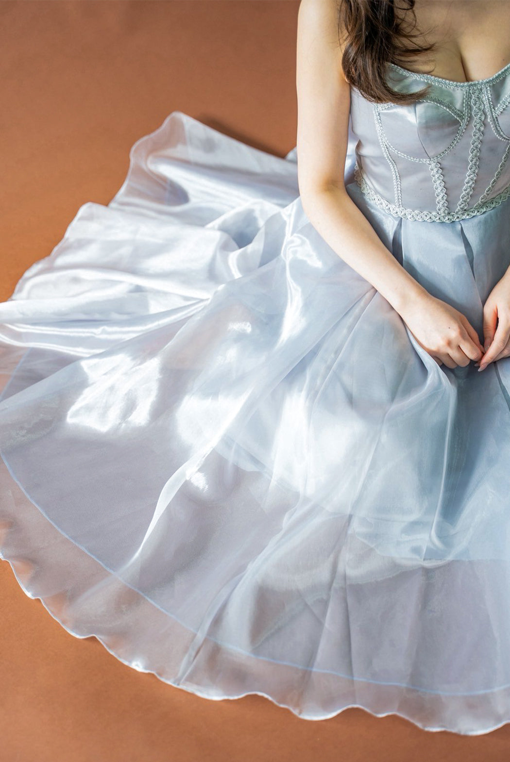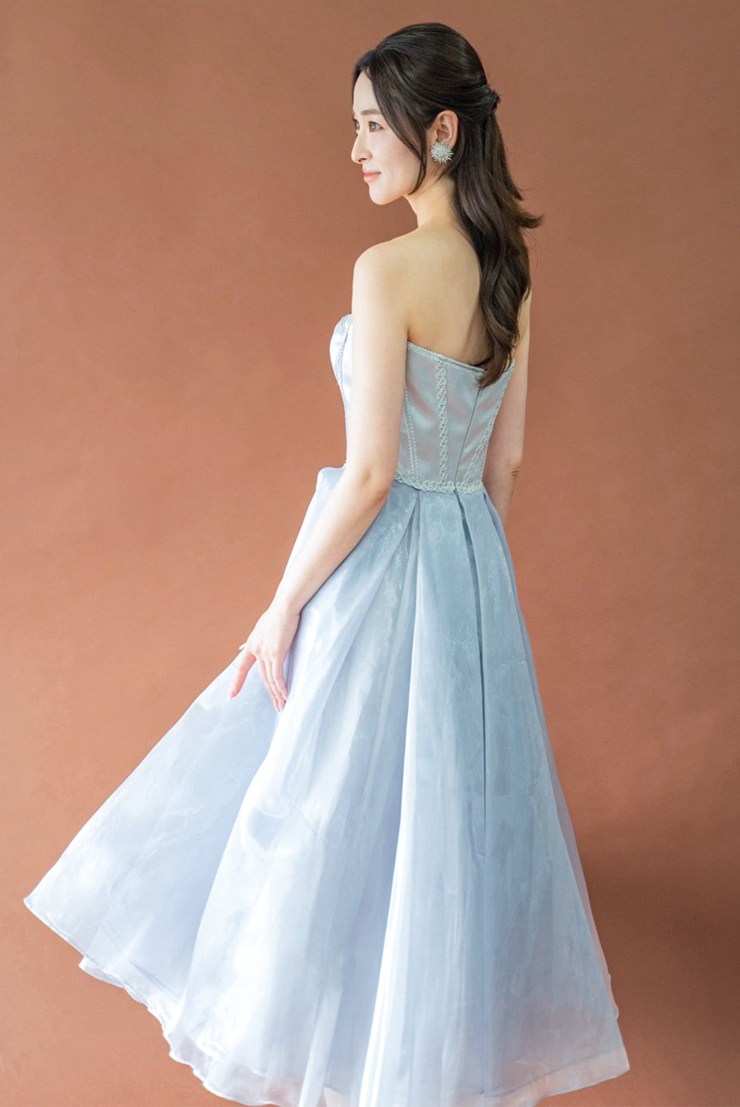 強さと勇敢さを称えた「透明感のある」シルバーグレーにAラインのエッセンスを加えることで素敵なドレスが誕生しました。